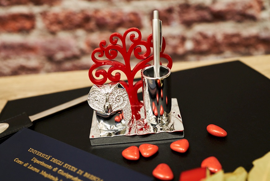 Portafoto della Laurea Zanolli in argento bilaminato. Cornice con finitura lucida e retro in legno.