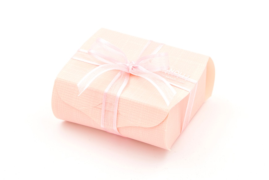 Scatola per bomboniera couvette rosa e 5 confetti alla mandorla bianchi. Articolo della Selezione Zanolli.